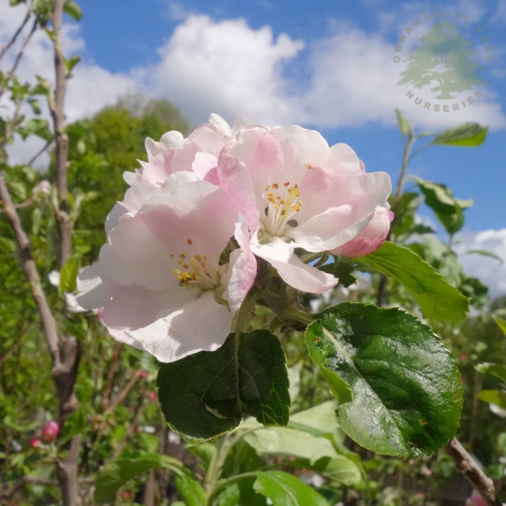 A tough variety from Oxford in 1740, Malus domestica 'Blenheim Orange' will cope well in less favourable and Northern positions. Expect reliable crops of large colourful apples in early October. As a triploid, Blenheim Orange will require two other apple tree pollinators or one self fertile pollinator in groups A, B or C within a half mile radius.